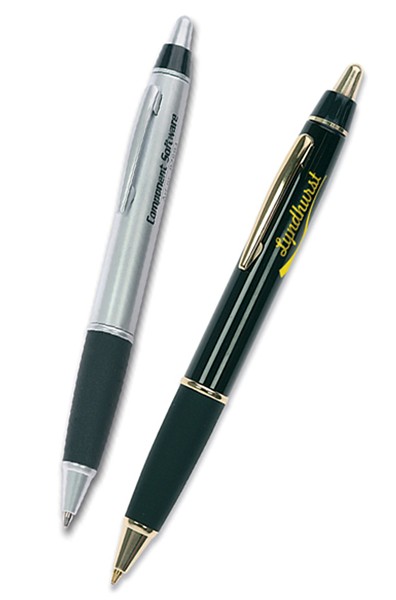 Kulspetspenna metall, kromad med silverdetaljer eller lackerad blå eller svart med guldfärgade detaljer. Gummigrepp.